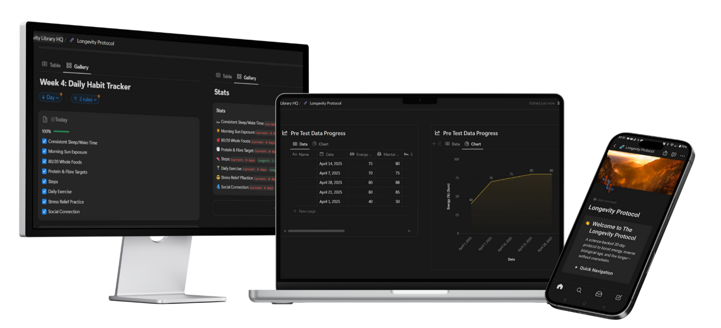 ✅ No extreme measures - All habits fit into normal life (no 5am ice baths!)Think of it as "operating system updates" for your biology - simple tweaks that compound into feeling 5-10 years younger.