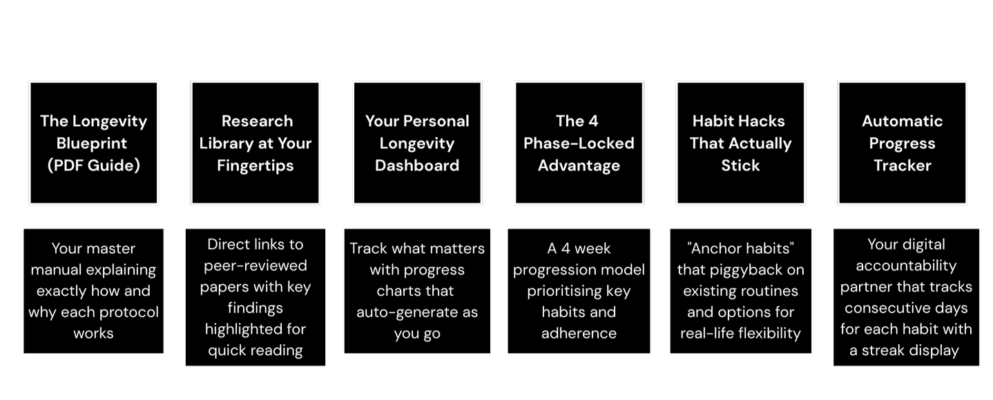 ✅ No extreme measures - All habits fit into normal life (no 5am ice baths!)Think of it as "operating system updates" for your biology - simple tweaks that compound into feeling 5-10 years younger.